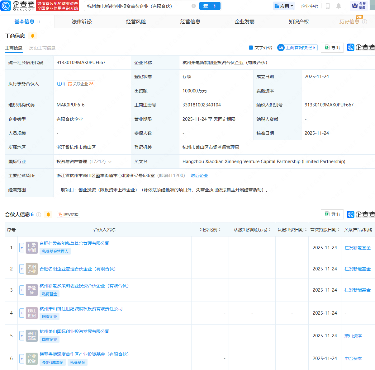 近日,杭州萧电新能创业投资合伙企业(有限合伙)成立,出资额10亿元无息外盘配资,经营范围包含:创业投资(限投资未上市企业)。企查查股权穿透显示,该合伙企业由阳光电源(300274)旗下杭州新能多策略创业投资合伙企业(有限合伙)、杭州萧山国际创业投资发展有限公司等共同持股。